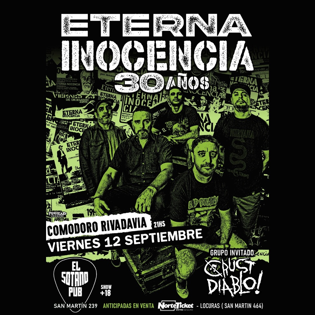 – En El Sótano Pub se presenta Eterna Inocencia, en medio de su “Gira 30 años”, junto a Crust Diablo (Caleta Olivia) como banda invitada. La tercera preventa es hasta hoy mismo, ingresando a https://linktr.ee/sotanopub o dirigiéndose hasta “Locuras” (San Martín 464). Las puertas abren a las 21:00.