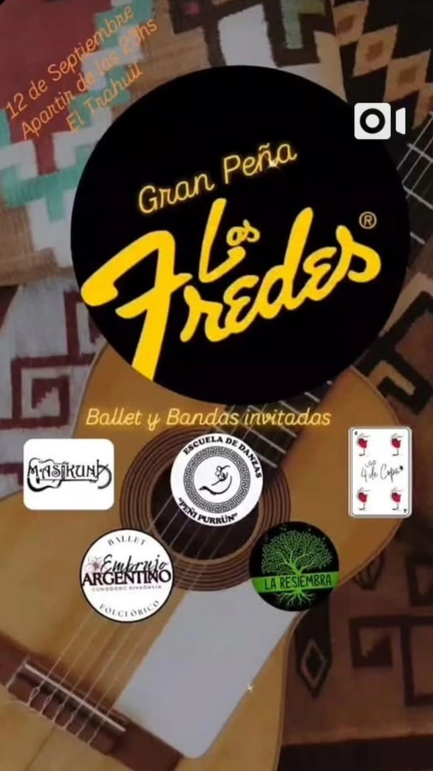 – En El Trahuil, desde las 23:00, hay Gran Peña Folklórica con Los Fredes, junto a Masikuna, Escuela de danzas Peñi Purrün, Los 4 de Copa, Ballet Embrujo Argentino y La Resiembra.