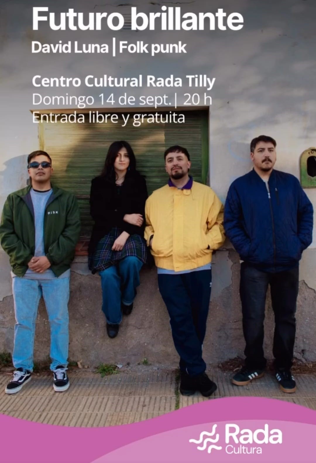 – En el Centro Cultural Rada Tilly, a partir de las 20:00, la banda de folk punk Futuro Brillante presenta su primer álbum “Algo bien!”, con entrada libre y gratuita.