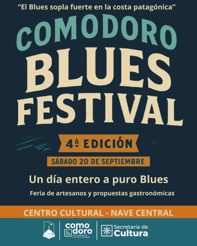 – En el Centro Cultural, de 15:00 a 00:30, se realiza la 4ª edición del “Comodoro Blues Festival”, con entrada libre y gratuita. El evento cuenta con feria de artesanos, propuestas gastronómicas, taller de blues abierto a todo público en el Auditorio y shows en vivo durante toda la tarde y noche, con bandas de la región y artistas de proyección internacional.