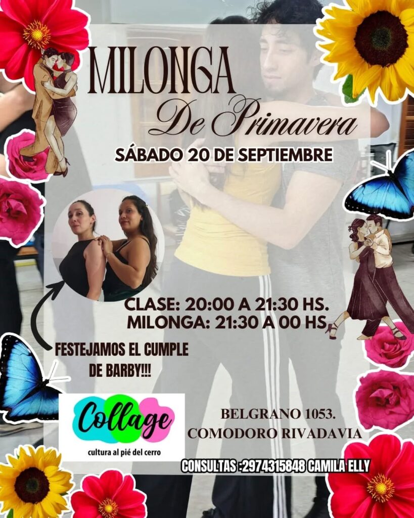 – En Collage se realiza el taller “Milonga de Primavera”. De 20:00 a 21:30 hay clase de tango y de 21:30 a 00:00 hay milonga. Consultas al 297-4315848.