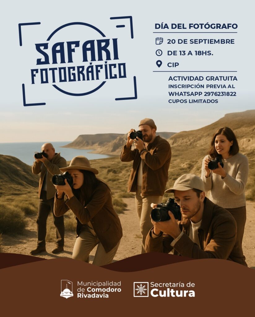 – En el marco del Día del Fotógrafo, de 13:00 a 18:00, se realiza un Zafari Fotográfico para explorar cada mirada, sin distinción de nivel técnico. La actividad es gratuita, con inscripción previa, y los cupos son limitados. El número de contacto es 297-6231822. El objetivo es cerrar la jornada en un espacio de encuentro con vistas a la organización de una muestra fotográfica.
