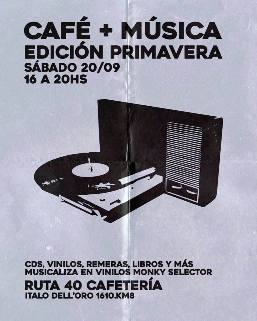 – En la cafetería Ruta 40 de Km 8, de 16:00 a 20:00, se realiza la 1ª edición de la feria “Café + Música Edición Primavera”, donde se podrán encontrar CD’s, cassettes, vinilos, remeras y libros, además de Arte Latte y todas las delicias de la cafetería. Participan: Comodoro Hobbys, MetalTshirt Remeras, Blaspherion Distro y Unification Distro. Musicaliza en vinilos Monky Selector Mono Rodríguez. La entrada es libre y gratuita.
