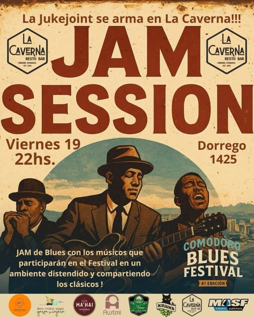 – En La Caverna Resto-Bar, a partir de las 22:00, hay noche de blues con una Jam Session previa al Comodoro Blues Festival. Se presentan Halftime Blues, Puje Jazz, The Original Blues Company, Emiliana Duflós y muchísimos artistas más. La entrada es libre y gratuita.