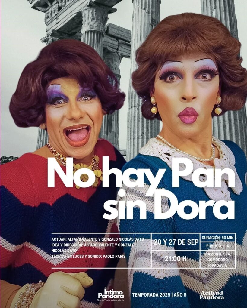 – En Actitud Pandora, a partir de las 21:00, se presenta “No hay Pan sin Dora”, una obra para reír de principio a fin, interpretada y dirigida por Alfaro Valente y Gonzalo Nicolás Dato. Reservas, al 297-4161200.