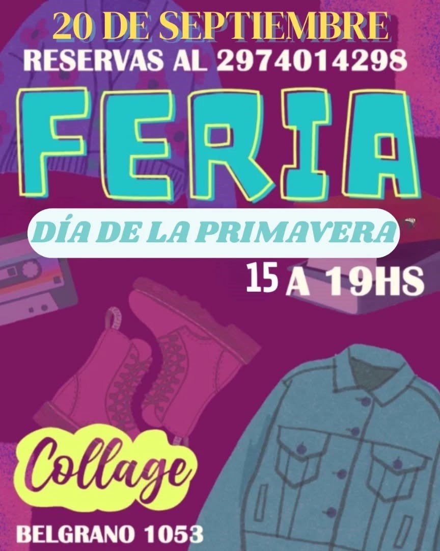 – En Collage hay Feria de la Primavera, de 15:00 a 19:00, con artesanías, ropa, gastronomía, arte y mucho más. Consultá por tu stand al 297-4014198.