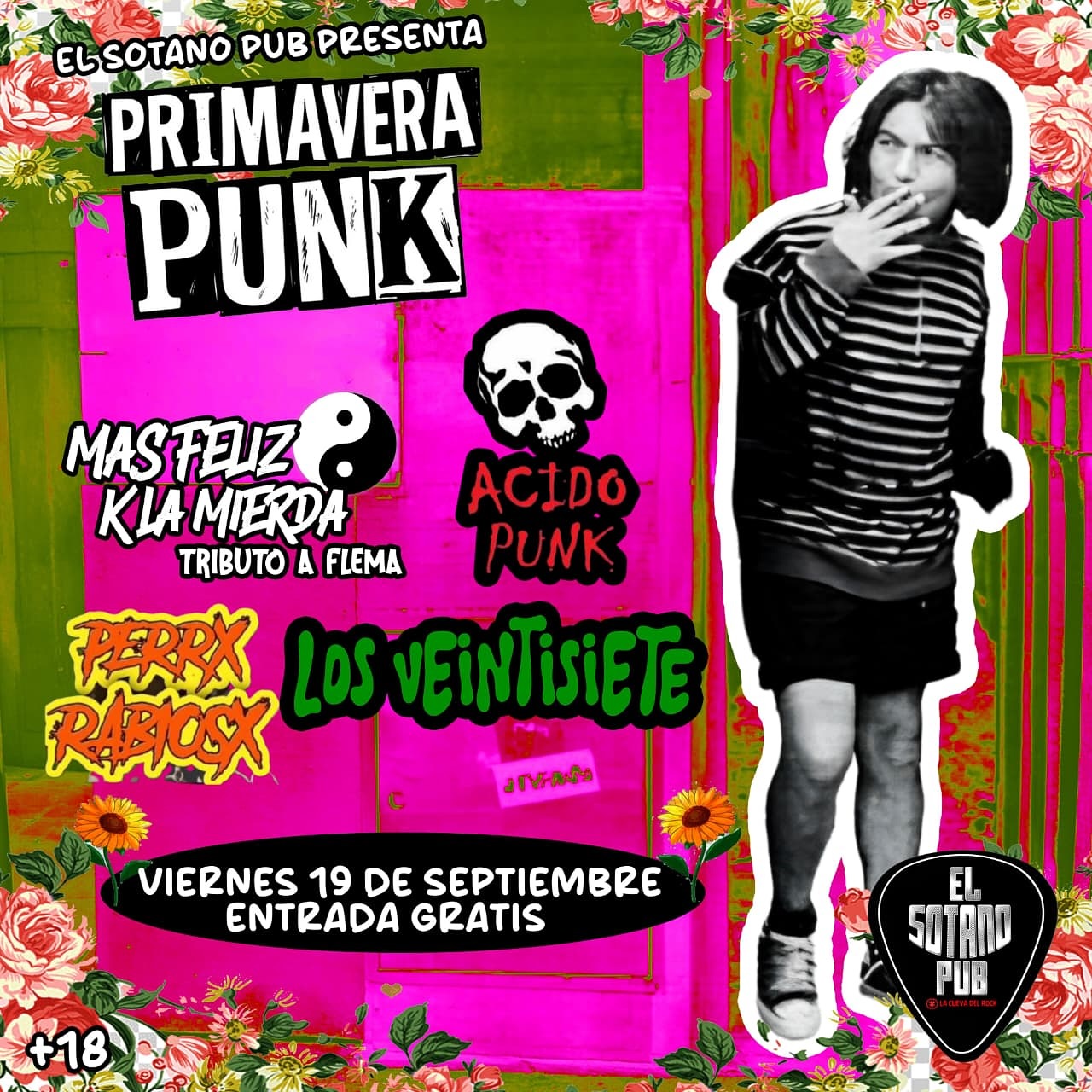 – En El Sótano Pub se realiza el festival “Primavera Punk”, con las presentaciones de Más Feliz K La Mierda (tributo a Flema), Los 27, Perrx Rabiosx y Ácido Punk. Las puertas abren a las 20:00 y la entrada es gratis. El show es para mayores de 18 años.