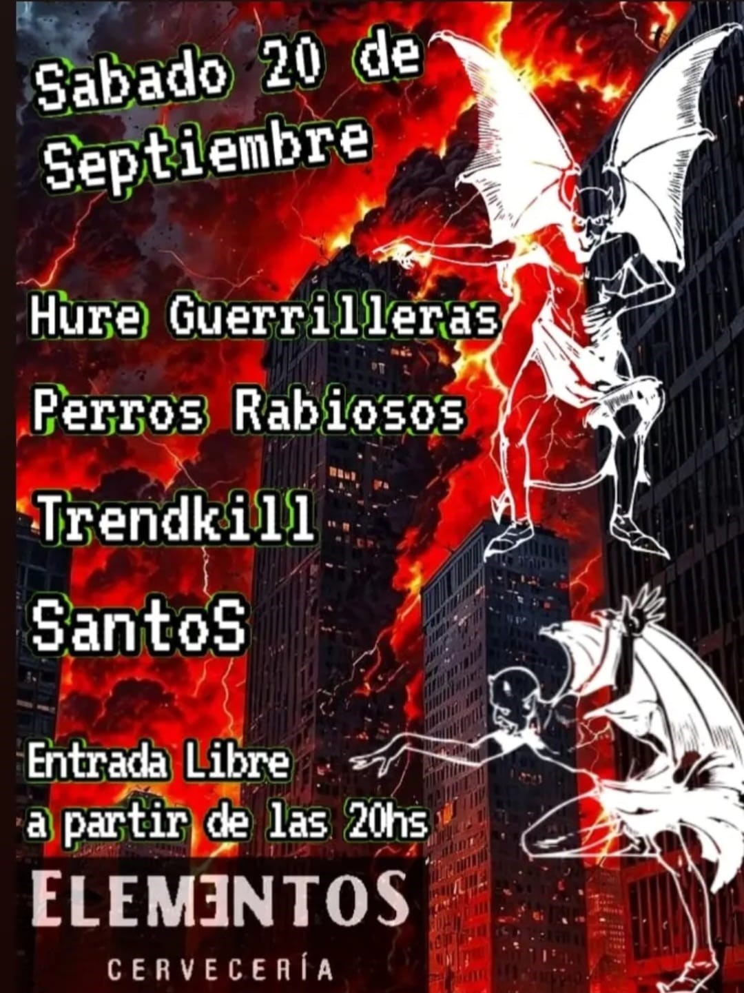 – En Elementos Cervecería, a partir de las 20:00, tocan Santos, Trendkill, Perros Rabiosos y Hure Guerrilleras.