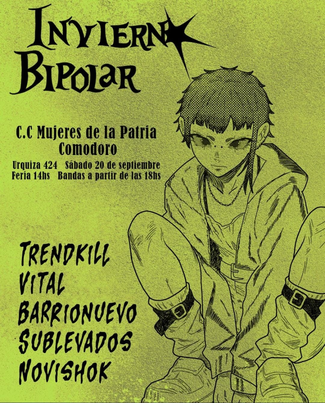 – En el Centro Cultural Mujeres de la Patria (Urquiza 424) se realiza el festival solidario “Invierno Bipolar”, con las presentaciones de Novishok, Trendkill, Barrionuevo Hardcore y Sublevados. Hay feria a partir de las 14:00 y las bandas arrancan a las 18:00. La entrada tiene un valor de $2.000, o un alimento no perecedero.