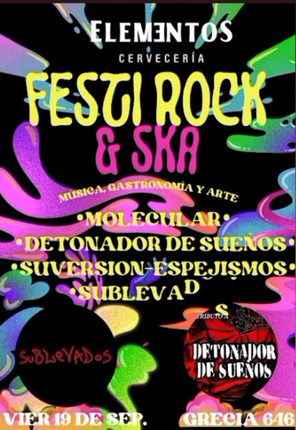 – En Elementos Cervecería, a partir de las 20:00, hay noche de rock y ska, con las presentaciones de Molecular, Detonador De Sueños (tributo a La Renga), Su Versión (tributo a Todos Tus Muertos), Espejismos y Sublevados.