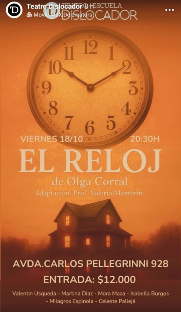 – En el Teatro Dislocador, a partir de las 20:30, se presenta la obra “El reloj”, de Olga Corral, en una adaptación de Valeria Mambrin. La entrada tiene un valor de $12.000.