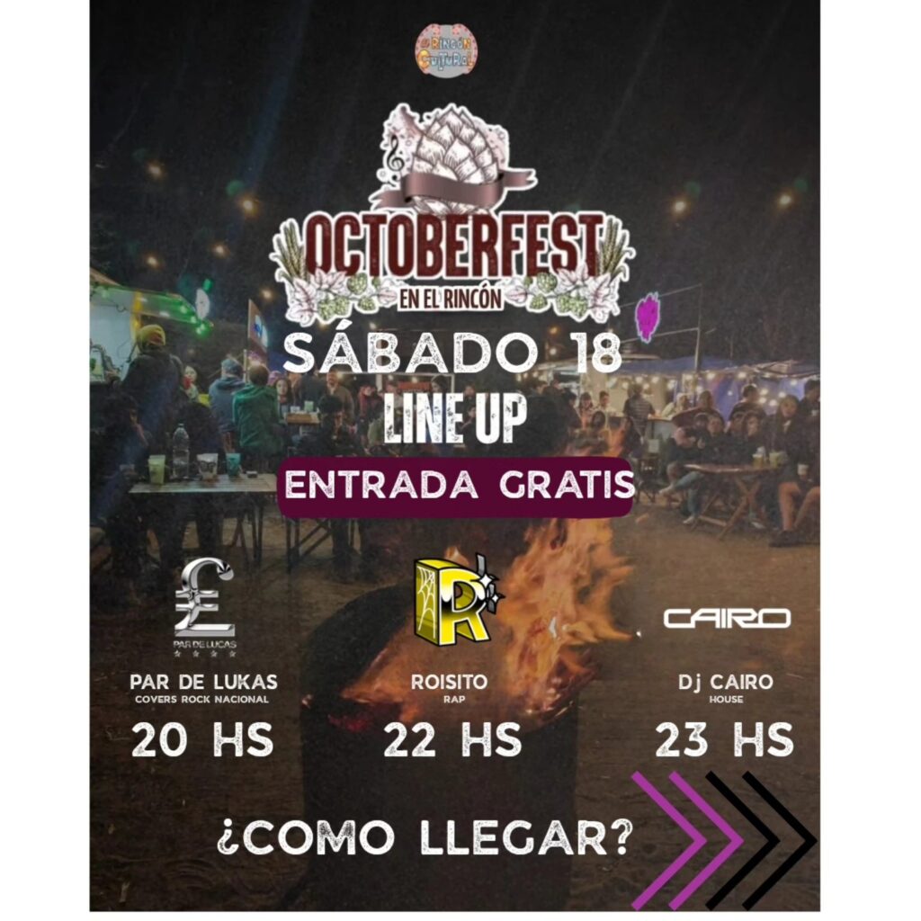 – En el Rincón Cultural del Cordón Forestal, de 18:00 a 2:00, se realiza el tercer día del “Oktober Fest”, con entrada libre y gratuita. Hay música en vivo, artesanos, cerveceros y gastronomía. Se presentan Par de Lucas (covers del rock nacional) a las 20:00, Roisito (rap) a las 22:00 y DJ Cairo (house) a las 23:00.