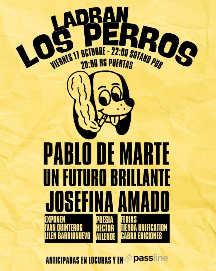 – En El Sótano Pub se realiza una nueva edición de “Ladran los perros”, el festival que ya es de la casa y que sigue creciendo en cada encuentro. En esta oportunidad, se presentan Pablo de Marte, Josefina Amado y Un Futuro Brillante. Además, hay poesía en vivo, arte y feria. Las puertas abren a las 20:00 y los shows comienzan a las 22:00. Preventa de anticipadas con descuento: Locuras (San Martín 464) y por sistema @passline_argentina. Link https://linktr.ee/sotanopub