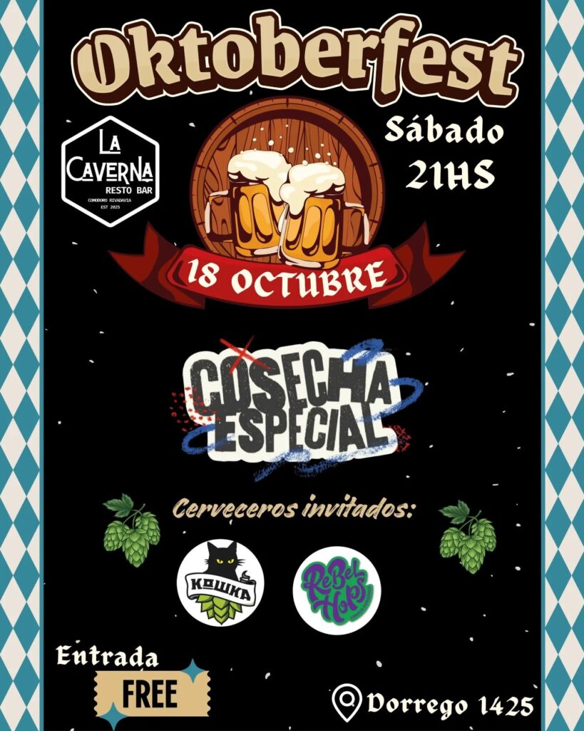 – En La Caverna Resto-Bar se realiza el Oktoberfest, a partir de las 21:00, junto a Cosecha Especial en vivo y las cervecerías invitadas Kowka y Rebel Hop. La entrada es libre y gratuita y las puertas abren a las 19:00.