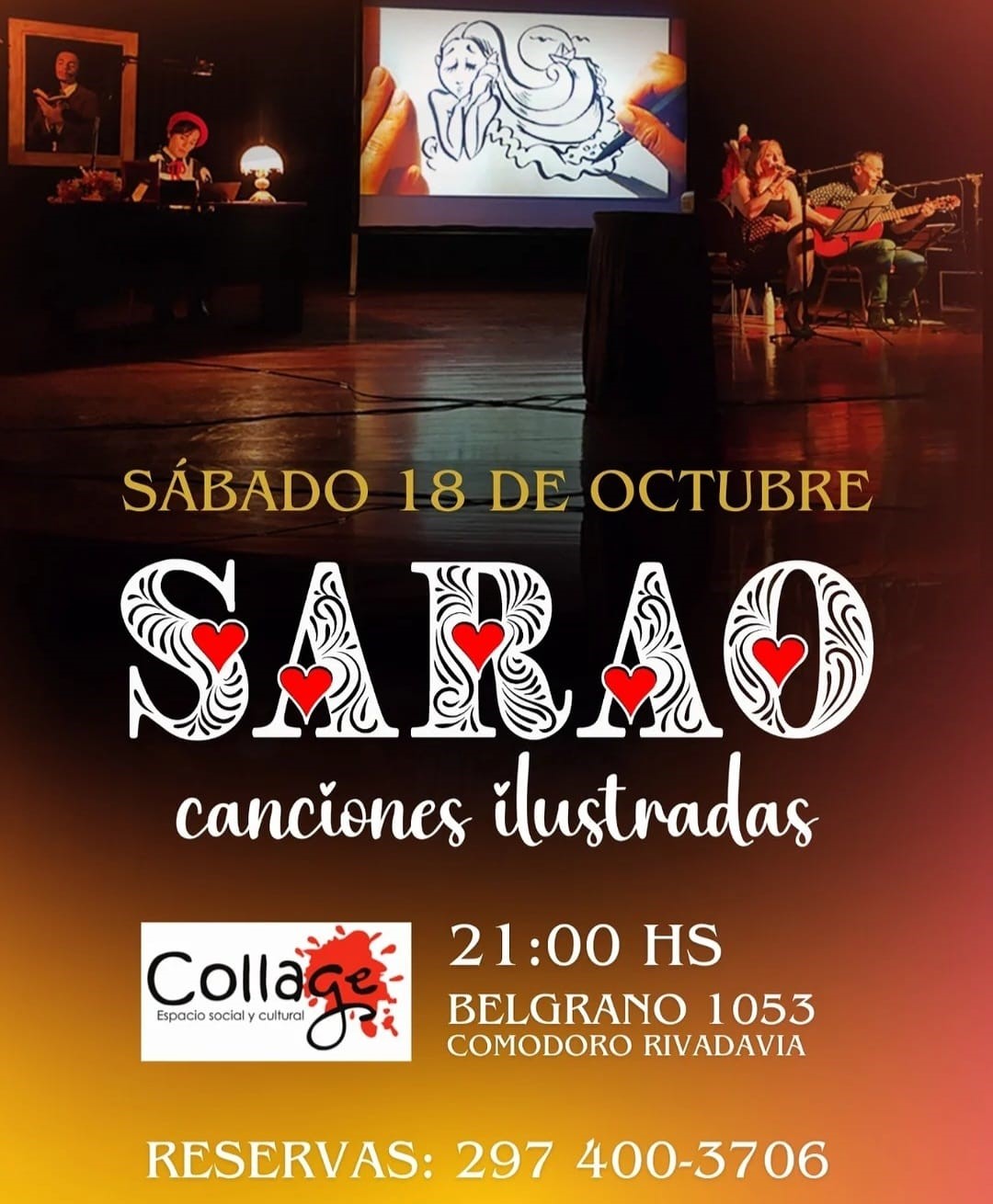 – En Collage, desde las 21:00, se presenta el ciclo “Sarao, canciones ilustradas”, un espectáculo que combina música en vivo, ilustración y poesía en una experiencia artística íntima y sensorial, donde el sonido y la imagen dialogan: mientras la música recorre boleros, tangos, milongas y canciones populares, el dibujo en vivo transforma cada nota en relato visual.
