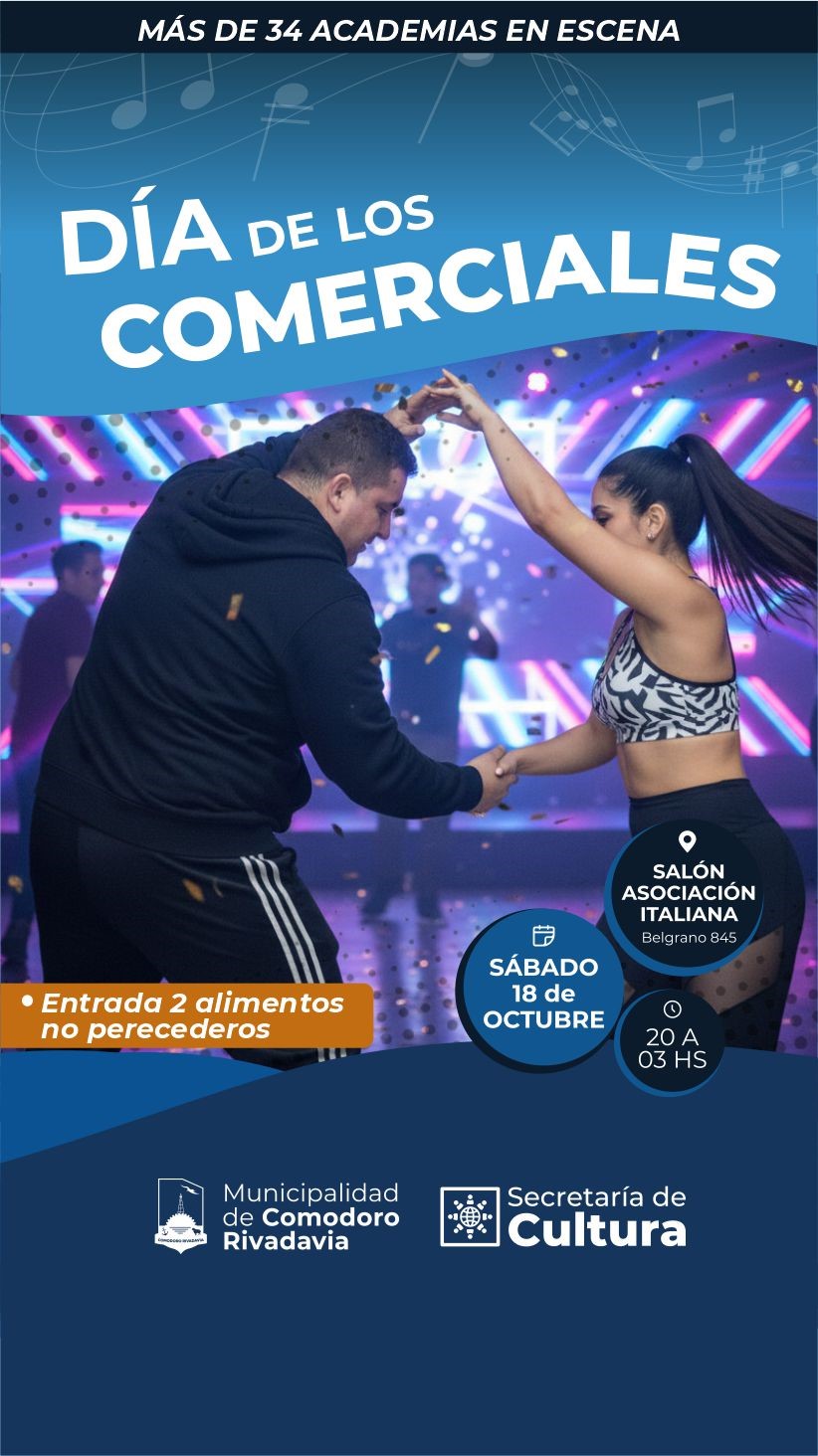 – En la Asociación Italiana, de 20:00 a 3:00, se celebra el “Día de los Comerciales”, con más de 34 academias en escena. La entrada consiste en dos alimentos no perecederos.
