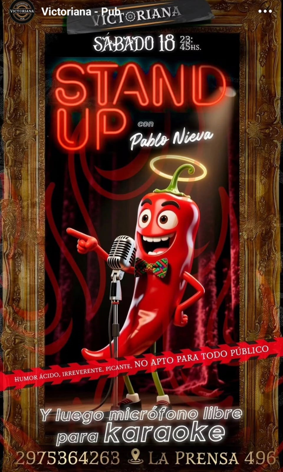 – En Victoriana Pub, desde las 23:45, hay show de stand up con el humor ácido, irreverente y picante de Pablo Nieva. Después, hay micrófono libre para karaoke.