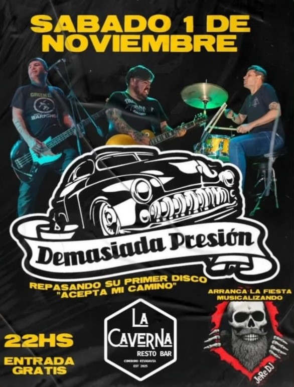 – En La Caverna Resto-Bar (Dorrego 1425) se presenta Demasiada Presión, a partir de las 22:00. Además, sonarán los vinilos de Jere Casares y hay calcos de la banda de regalo.