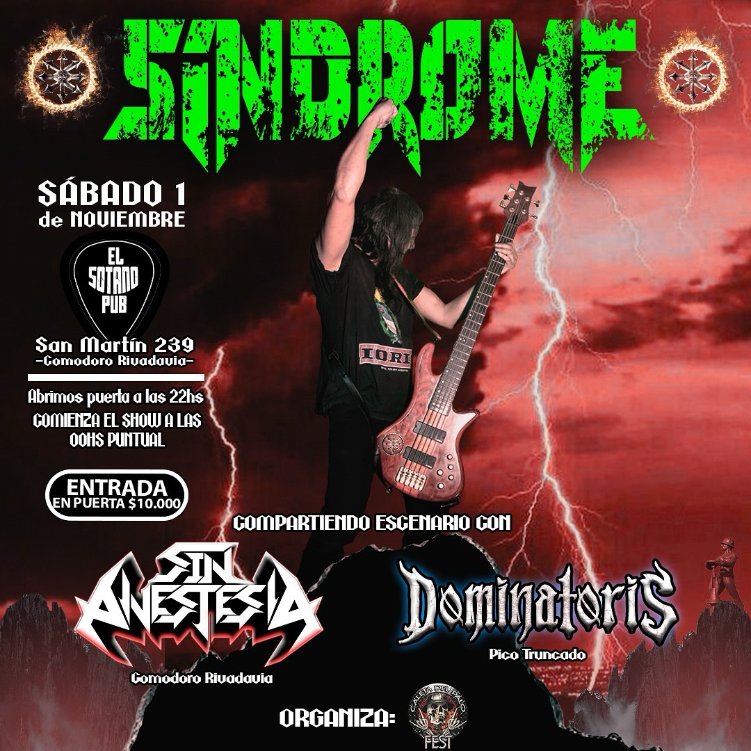 – En El Sótano Pub hay noche de thrash y death metal, con Síndrome de Caleta Olivia, Sin Anestesia de Comodoro Rivadavia y Dominatoris de Pico Truncado. Puertas y boletería abren a las 22:00 y el show arranca a las 00:00, puntual. La entrada tiene un valor de $10.000.