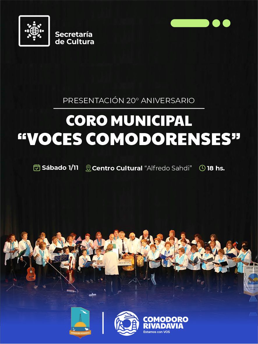 – En el Centro Cultural, desde las 18:00, el coro Voces Comodorenses festeja sus 20 años, junto a una importante cantidad de agrupaciones corales y la presencia de la Banda Infanto Juvenil Municipal.