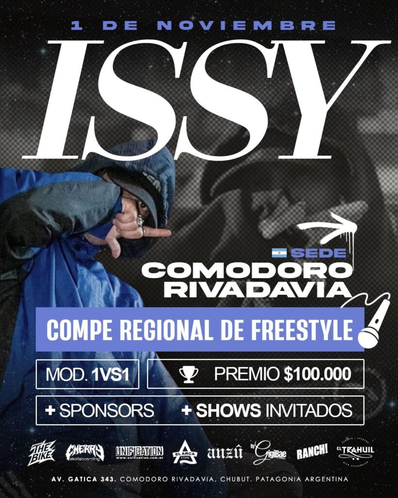 – En El Trahuil (Gatica 343) se presenta Issy, uno de los exponentes revelación en la escena del freestyle nacional, que llega desde Buenos Aires en el marco de su gira patagónica como primer preseleccionado de la competencia Regional de Freestyle con sede en Comodoro Rivadavia. Además, hay competencia de freestyle, modalidad 1 vs 1, con un premio de $100.000 + sponsors para el ganador. Las puertas abren a las 19:00.