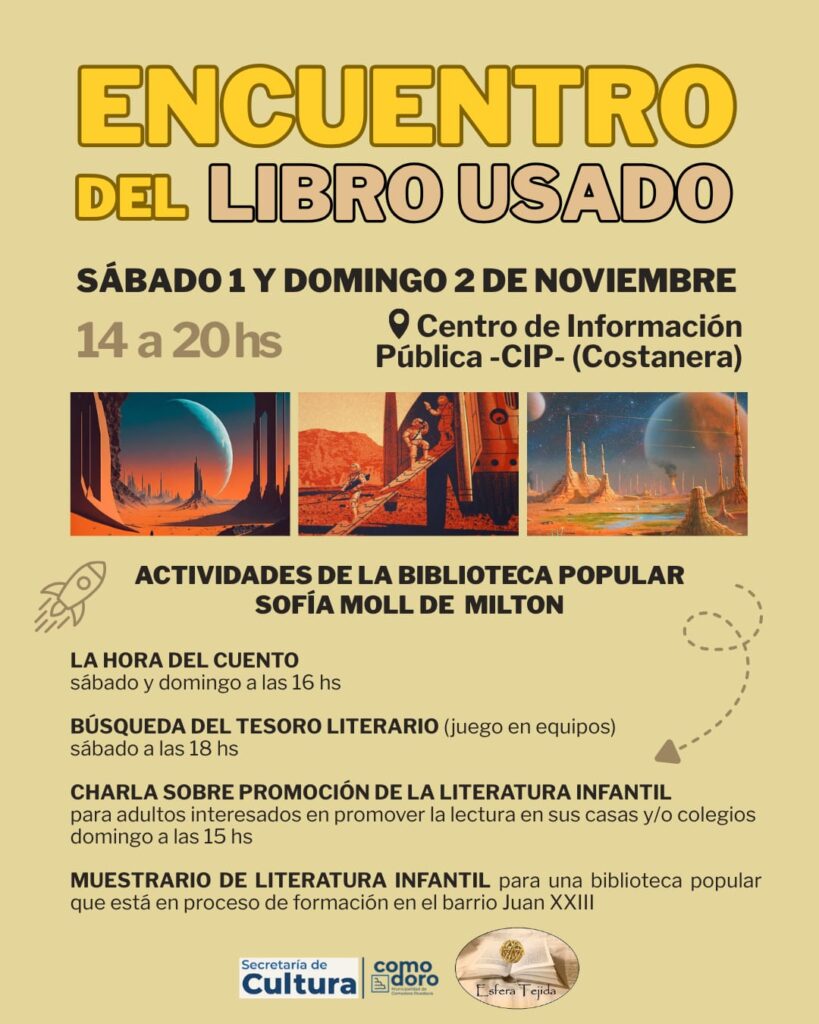 – En el Centro de Información Pública, de 14:00 a 20:00, se realiza un nuevo Encuentro del Libro Usado. Además de libros, se pueden encontrar, revistas, fanzines, autores locales y actividades de la biblioteca popular “Sofía Moll de Milton”.
