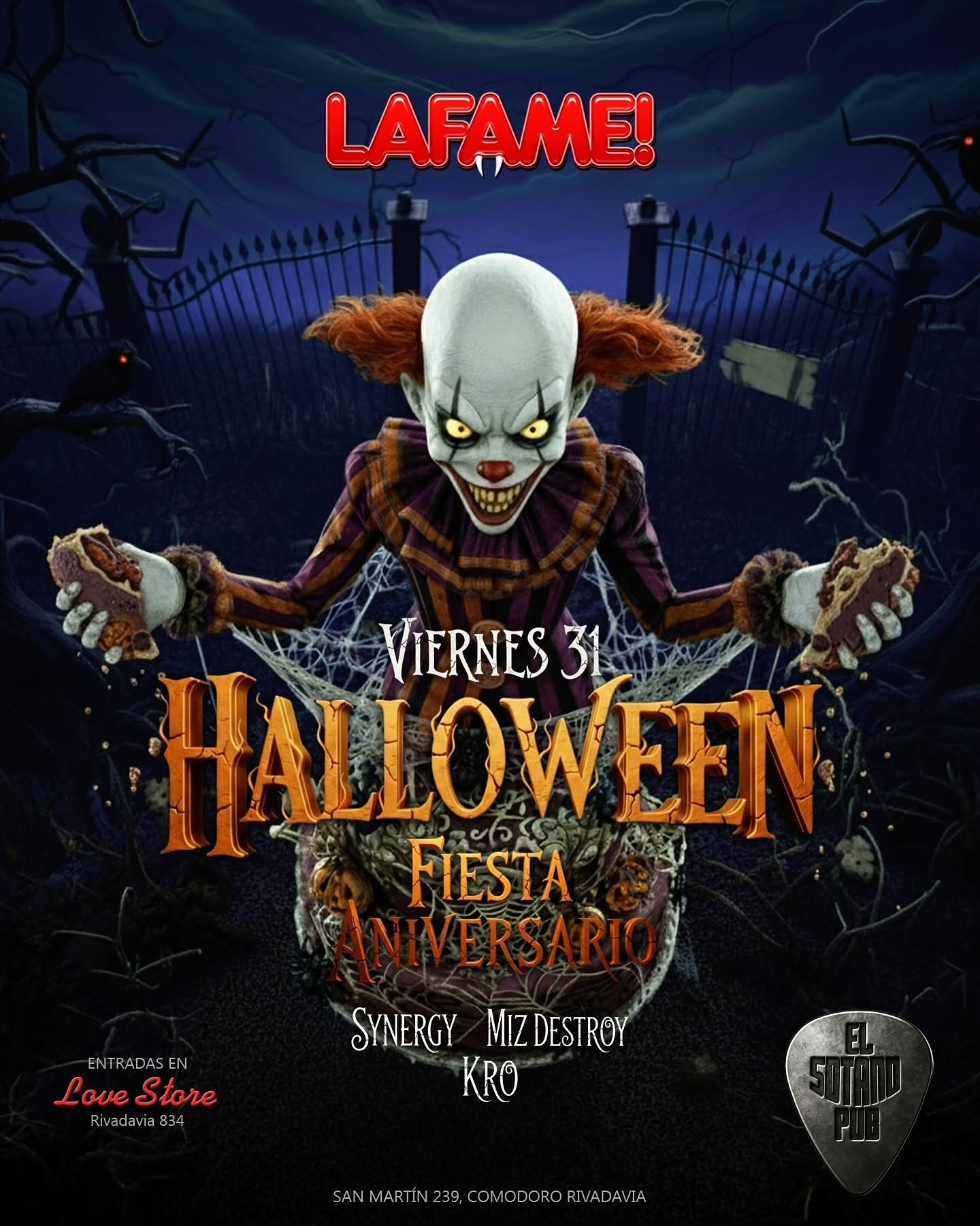 – En El Sótano Pub se festeja Halloween con la Fiesta Aniversario de “Lafame!”, donde habrá shows, elección del mejor disfraz y mucho más. Se presentan Synergy y Miz Destroy y sus Payasos Diabólicos.