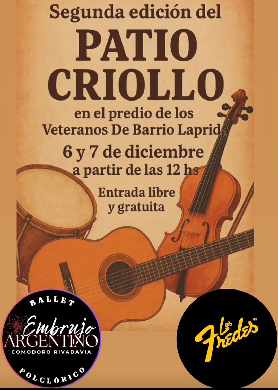 – En el predio del club de Veteranos del barrio Laprida, a partir de las 12:00, se realiza la 2ª edición del Patio Criollo, con las presentaciones de Los Fredes y del Ballet El Embrujo. La entrada es libre y gratuita.