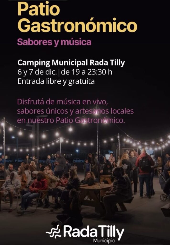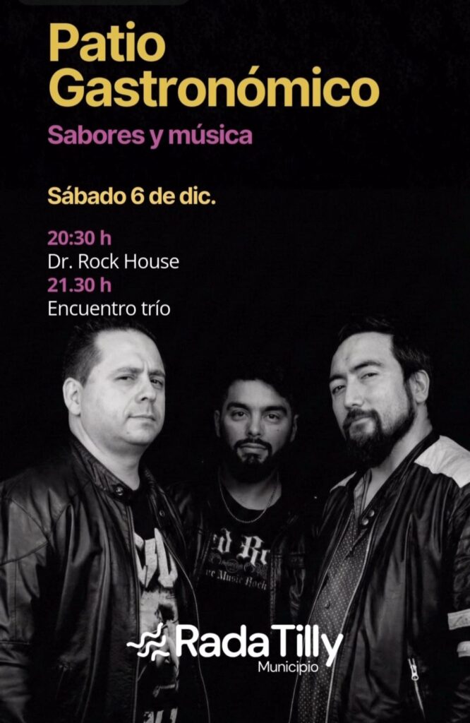 – En el Camping Municipal de Rada Tilly se realiza el Patio Gastronómico – Sabores y Música. El sábado a las 20:30 toca Dr. Rock House y a las 21:30 Encuentro Trío, mientras que el domingo a las 23:30 se presentan Good Fellas Rockabilly (Esquel) y Little Good Times.