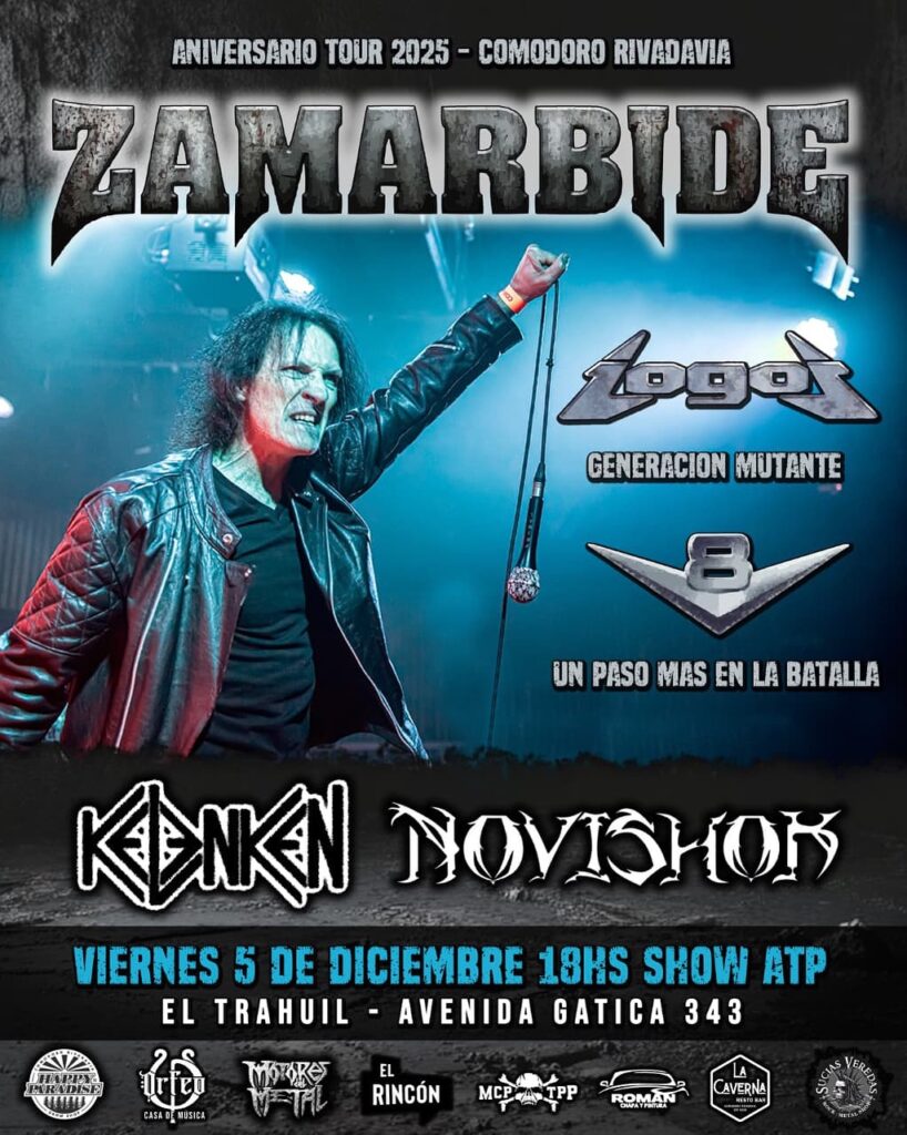– En El Trahuil (Gatica 343 – B° Industrial) se presenta Beto Zamarbide, ícono del metal nacional, en el marco de los 40 años de “Un paso más en la batalla” (V8) y los 30 años de “Generación mutante” (Logos), en una noche apta para todo público, llena de clásicos. Las bandas locales que acompañan son Novishok y Kelenken. Las puertas abren a las 18:00. Menores de 10 años no abonan entrada.