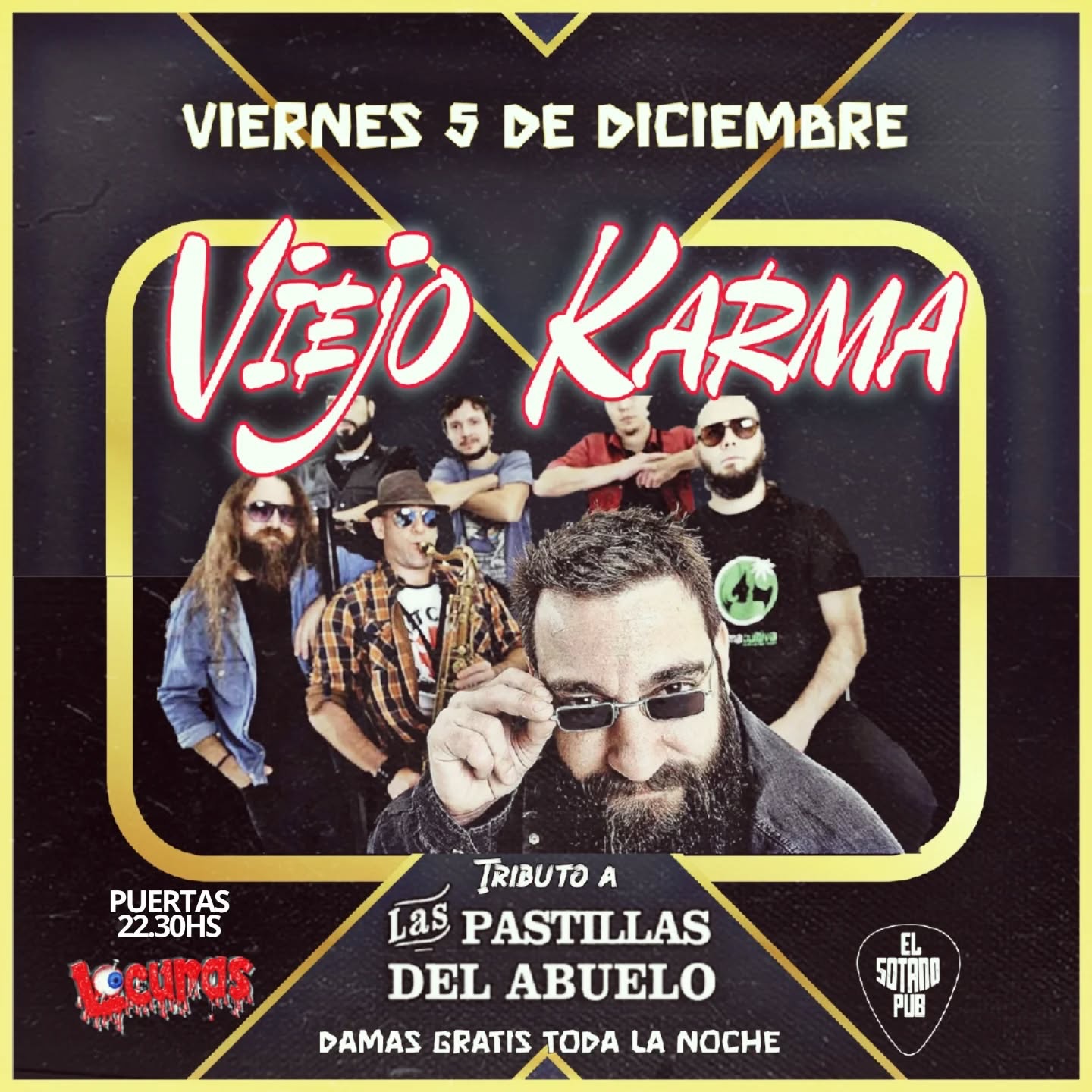 – En El Sótano Pub (San Martín 239), a partir de las 00:00 hs, toca Viejo Karma (tributo a Las Pastillas del Abuelo). Las anticipadas, a un valor de $10.000, se consiguen haciendo una transferencia al alias brian.fabio.1991 y en Locuras (San Martín 464). Las mujeres ingresan gratis.