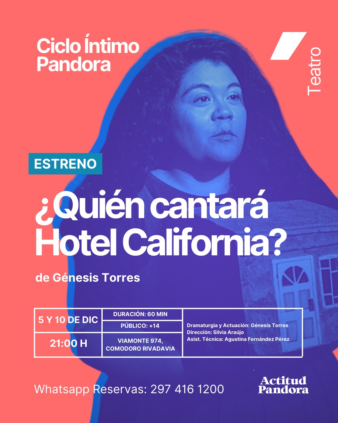 – En Actitud Pandora (Viamonte 974), a partir de las 21:00, se presenta la obra “¿Quién cantará Hotel California?”. Reservas, al 297-4161200.