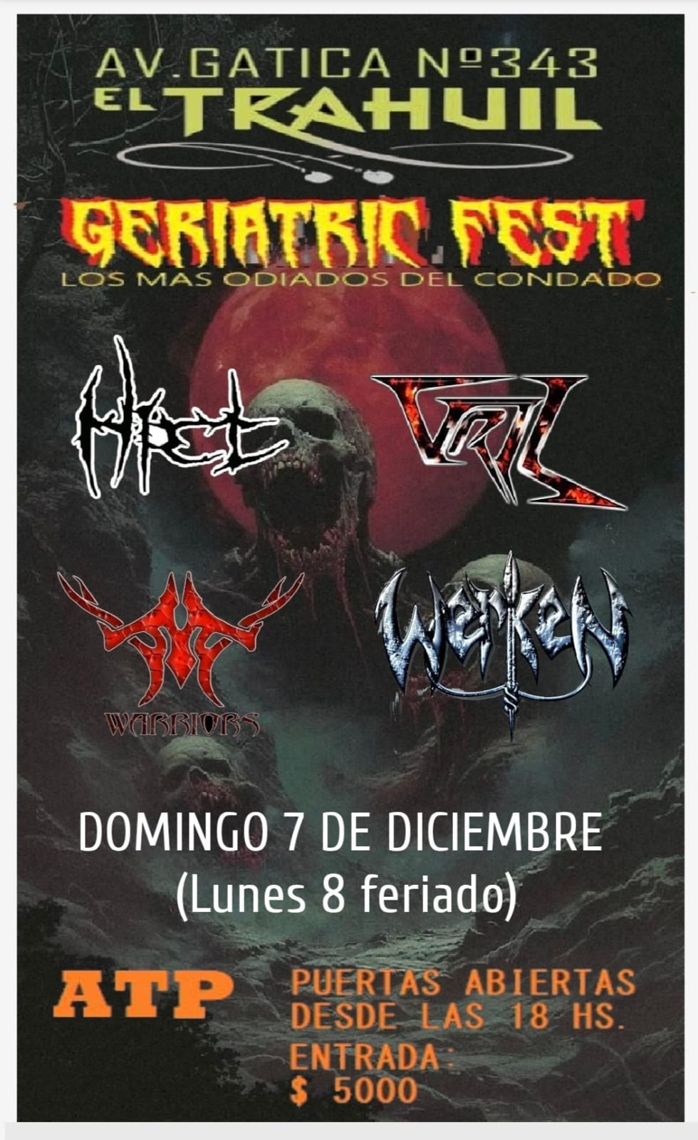 – En El Trahuil se realiza el festival de metal “Geriatric Fest, los más odiados del condado”, con Vril, Warriors, Hiel y Werken. Las puertas abren alas 18:00 y la entrada tiene un valor de $5.000.