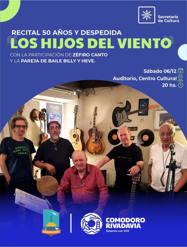 – En el Auditorio del Centro Cultural, desde las 20:00, se realiza el recital por los 50 años y despedida de Los Hijos del Viento, con la participación de Zéfiro Canto y los bailarines Billy y Heve.