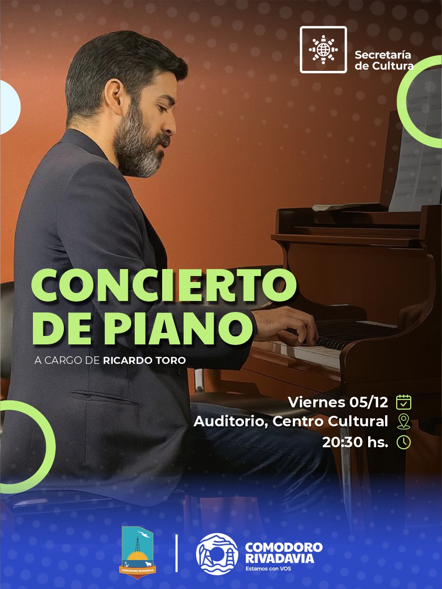 – En el Auditorio del Centro Cultural, desde las 20:30, hay Concierto de Piano de Ricardo Toro, en el marco del Ciclo Cultural.