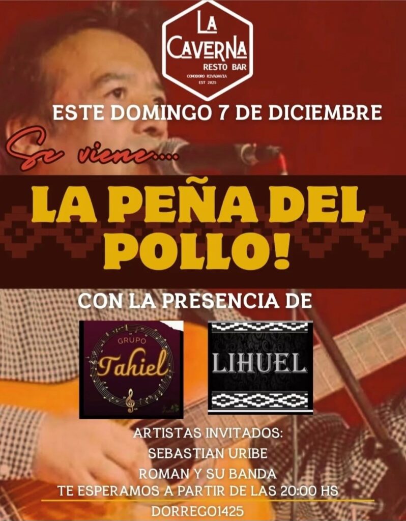 – En La Caverna Resto-Bar, desde las 20:00, se realiza la Peña del Pollo, con Grupo Tahiel, Lihuel, Sebastián Uribe y Román y su Banda.