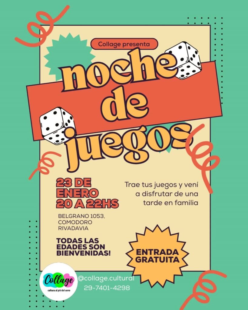 – En Collage hay “Noche de Juegos”, de 20:00 a 22:00, con juegos de mesa, ingenio y cartas. Llevar juego favorito o elegir los que estén a disposición. La entrada es libre y gratuita.