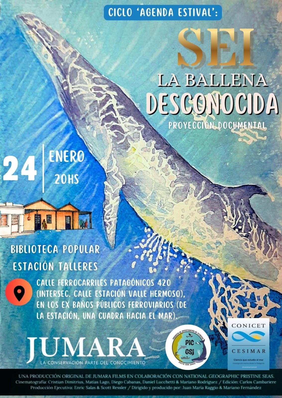 – En la Biblioteca Popular Estación Talleres de Km 5, desde las 21:00, se proyecta “Sei, la ballena desconocida”, con entrada libre y gratuita. El nuevo documental de Jumara Films junto a National Geographic Pristine Seas se estrenó recientemente en Comodoro Rivadavia, Rada Tilly y Ciudad de Buenos Aires. El film está basado en el proyecto que dirige Mariano Coscarella, investigador del CONICET y de la Universidad Nacional de la Patagonia San Juan Bosco, con apoyo de la Fundación Azara y otras instituciones. Una historia sobre ciencia, mar y futuro.