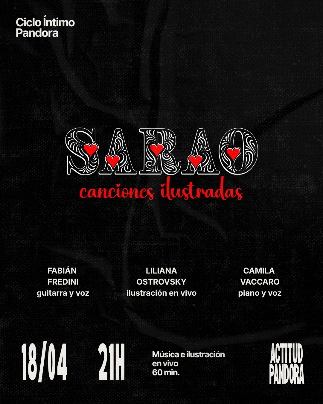 – En Actitud Pandora, desde las 21:00, se presenta “Sarao – Canciones Ilustradas”, un viaje sensorial de música y dibujos a cargo de Liliana Ostrovsky, Camila Vaccaro y Fabián Fredini.