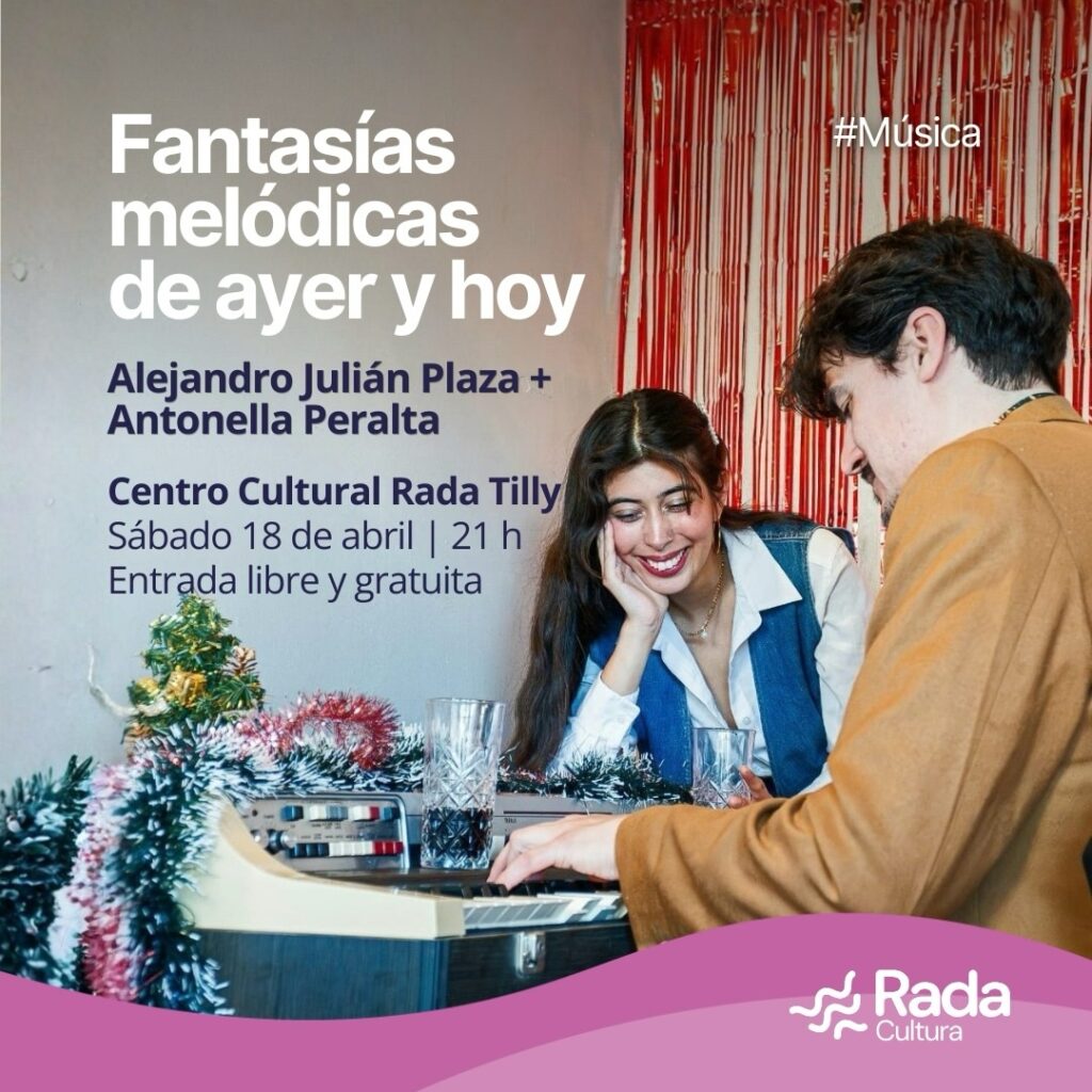 – En el Centro Cultural Rada Tilly, desde las 21:00, Antonella Peralta y Alejandro Julián Plaza presentan “Fantasías melódicas de ayer y hoy”, un viaje sonoro entre clásicos en español e inglés, con un clima íntimo y melancólico. La entrada es libre y gratuita.