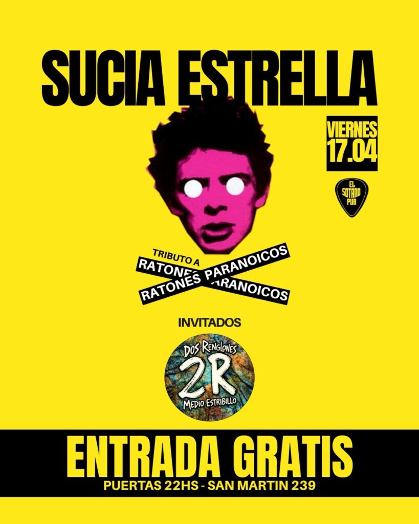 – En El Sótano Pub se presenta Sucia Estrella (tributo a Ratones Paranoicos), junto a Dos Renglones / Medio Estribillo como banda invitada. La entrada es gratuita y las puertas abren a las 22:00.