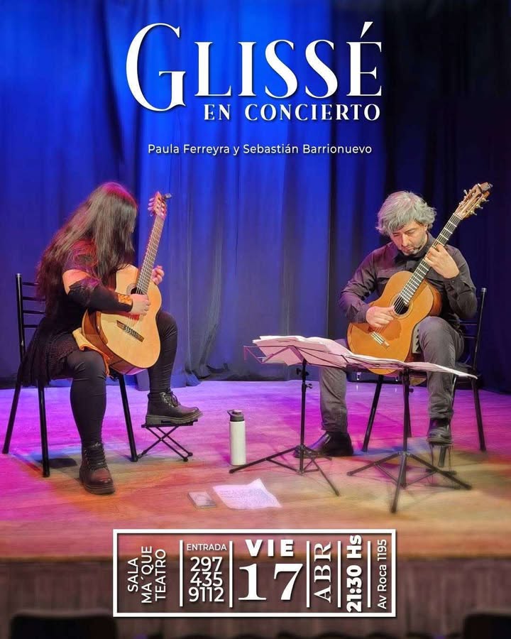 – En la sala Ma’ Que Teatro, desde las 21:30, se presenta el dúo de guitarra Glissé, compuesto por Paula Ferreyra y Sebastián Barrionuevo, con un concierto completamente acústico.