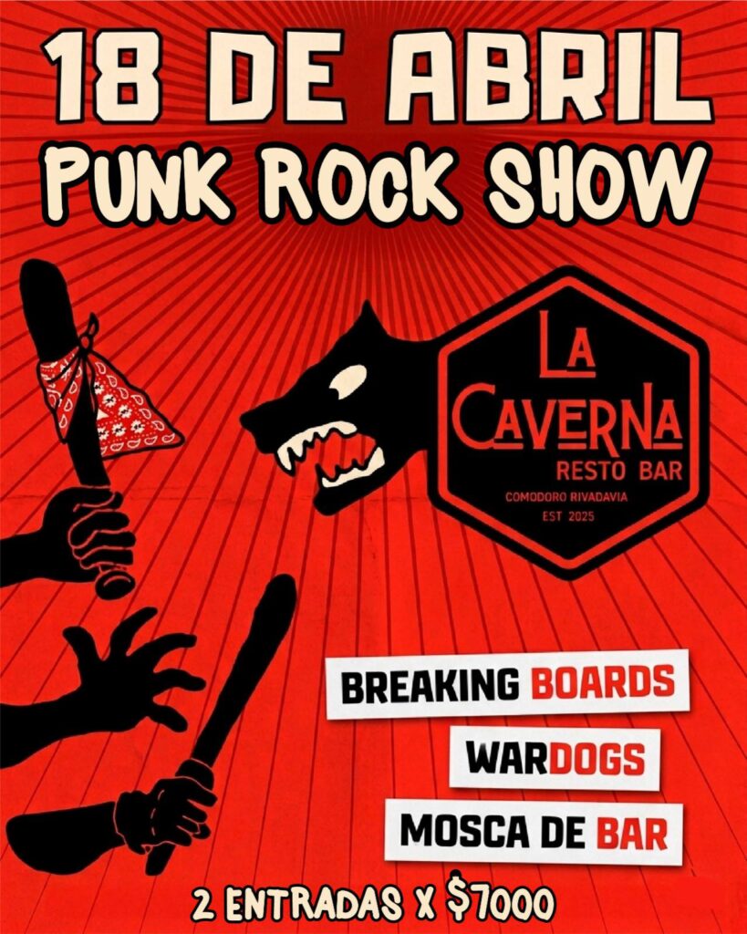 – En La Caverna Resto Bar, a partir de las 23:00, hay noche de punk rock con Mosca de Bar (tributo a 2 Minutos), Wardogs y Breaking Boards. Entradas: 2 x $7.000. Las puertas abren a las 19:00.