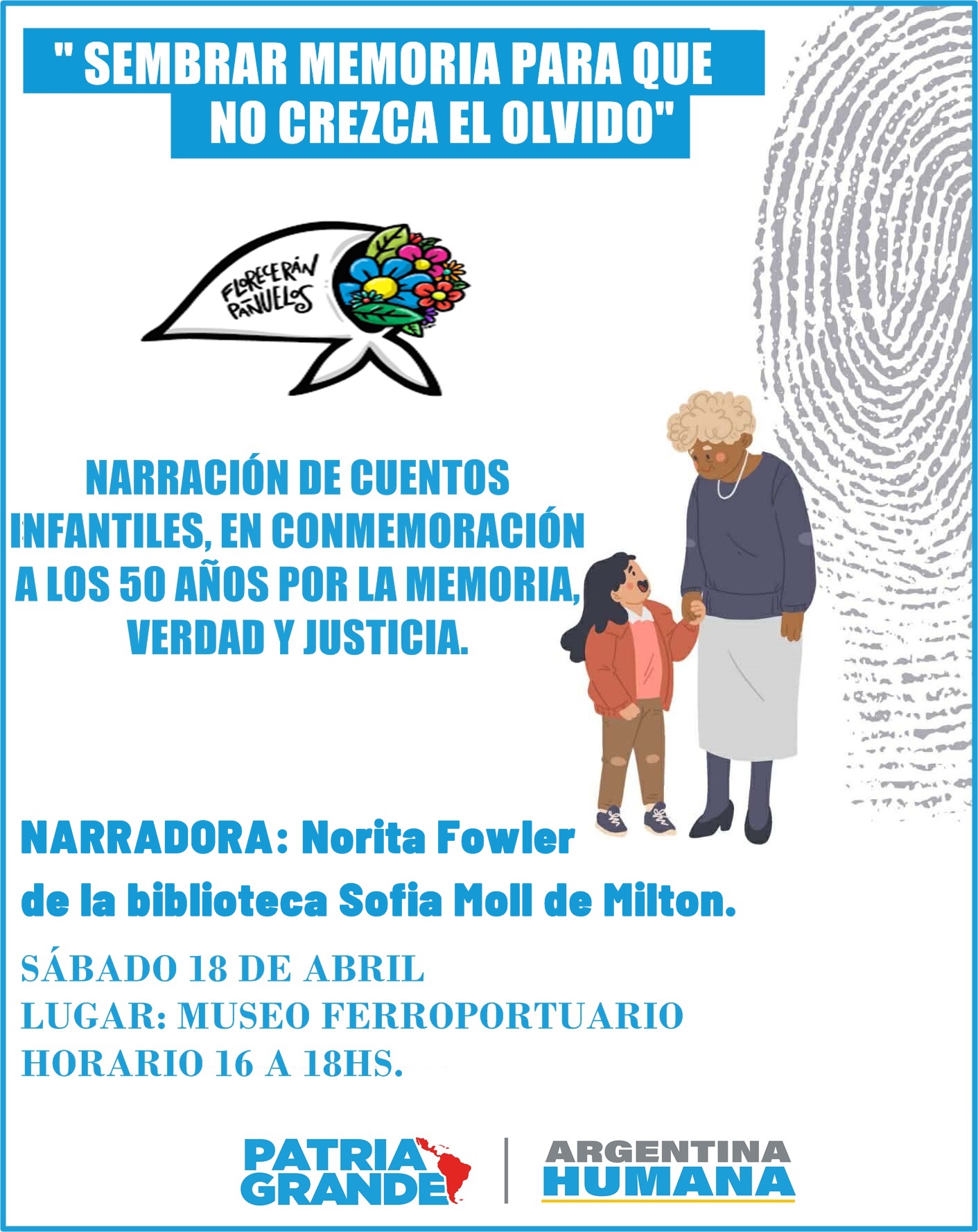 – En el Museo Ferroportuario, desde las 16:00, se realiza la narración de cuentos infantiles “Sembrar memoria para que no crezca el olvido”, a cargo de Norita Fowlner, de la biblioteca Sofía Moll de Milton.