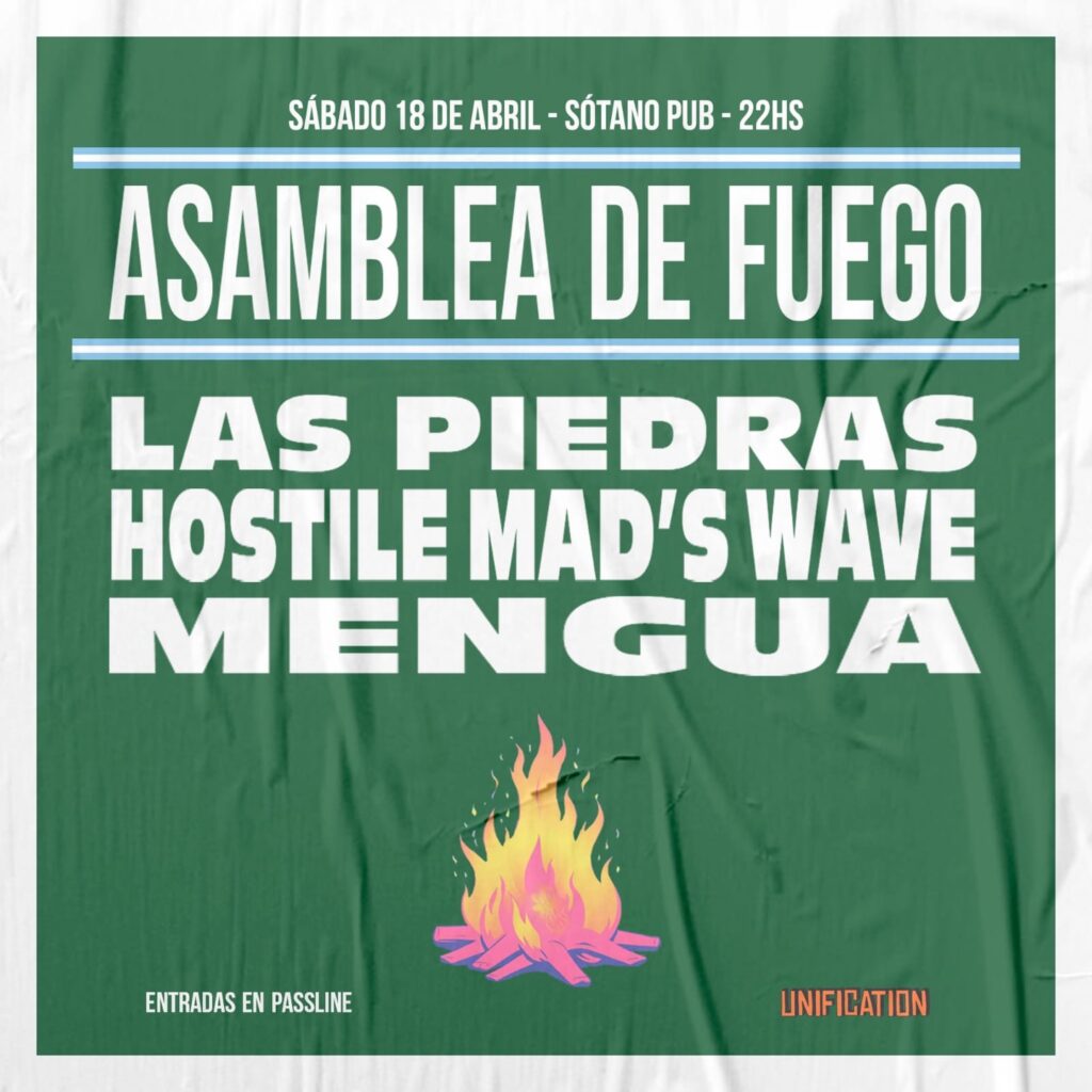 – En el Sótano Pub, desde las 22:00, se realiza la “Asamblea de Fuego”, una noche para prender todo con Las Piedras, Mengua y Hostile Mad’s Wave arriba del escenario y ferias amigas. Anticipadas en https://www.passline.com/eventos/asamblea-de-fuego. Ya se agotó la primera preventa de 2×1 a $5.000. La segunda preventa es de $8.000 y en puerta cuesta $10.000.