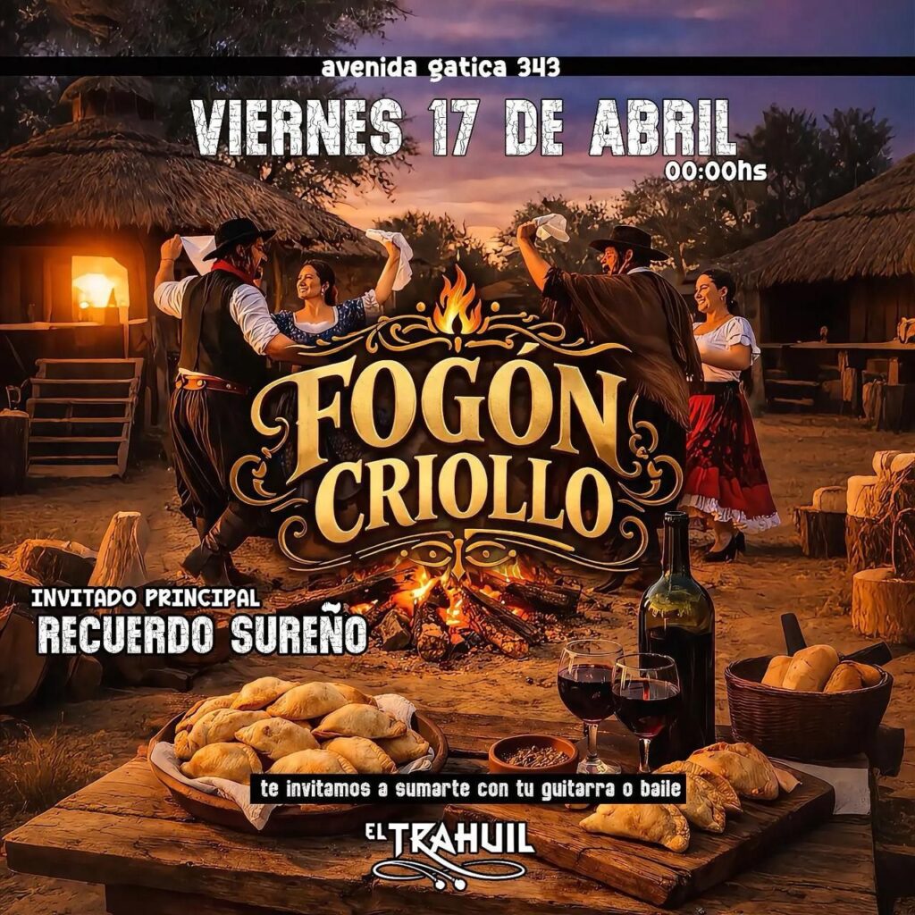 – En El Trahuil, desde la medianoche, se realiza un nuevo “Fogón Criollo” después de un pequeño receso, con la presentación de Recuerdo Sureño. También están invitados quienes quieran sumarse con su guitarra o a bailar.