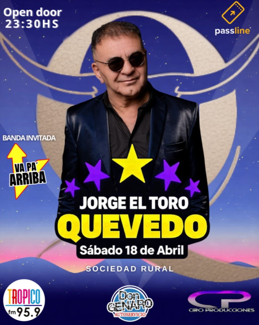 – En la Sociedad Rural se presenta Jorge “El Toro” Quevedo, con Va Pa’ Arriba como banda invitada. Las puertas abren a las 23:30 y las entradas se consiguen en www.passline.com.
