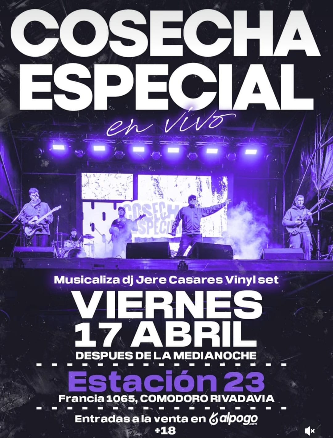 – En Estación 23, después de la medianoche, se presenta Cosecha Especial. Además, musicaliza la noche Jere Casares con sus vinilos. Las entradas están a la venta en www.alpogo.com. Anticipadas hasta las 00:00 hs, a $8.000. En puerta, $10.000.