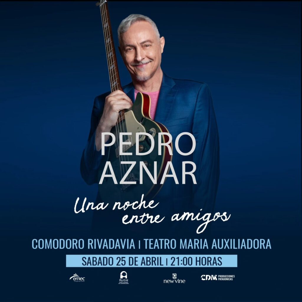 – En el Teatro María Auxiliadora, desde las 21:00, se presenta Pedro Aznar, que regresa una vez más a Comodoro Rivadavia y esta vez con su concierto “Una noche entre amigos”, donde sonarán temas de John Lennon, Paul McCartney, George Harrison, Charly García, Sting, León Gieco, Peter Gabriel, Red Hot Chili Peppers, Queen, Luis Alberto Spinetta, Cazuza, Elton John y algunas canciones propias. Entradas online en www.cdmticket.ar o físicas en Don José Hogar.