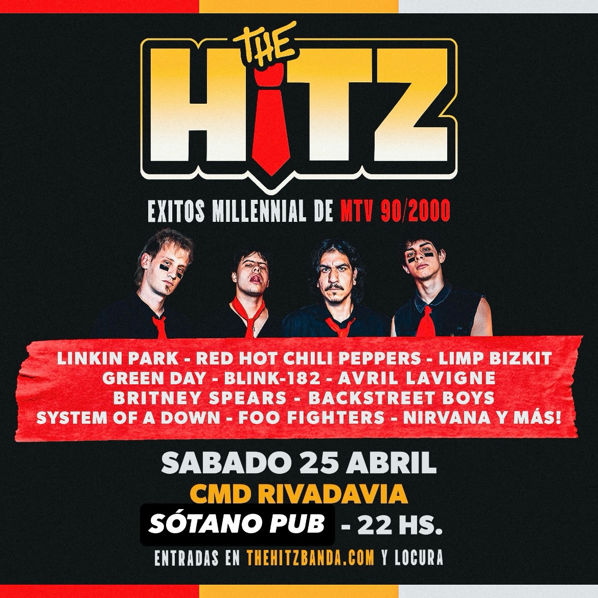 – En El Sótano Pub, desde las 22:00, se presenta The Hitz, para revivir los éxitos millenials de los 90’s y los 2000, recreando temas de bandas como Linkin Park, Green Day, Blink-182, Avril Lavigne, System of a Down, Nirvana y muchos más. Entradas en https://linktr.ee/sotanopub y en Locuras.